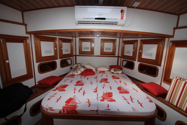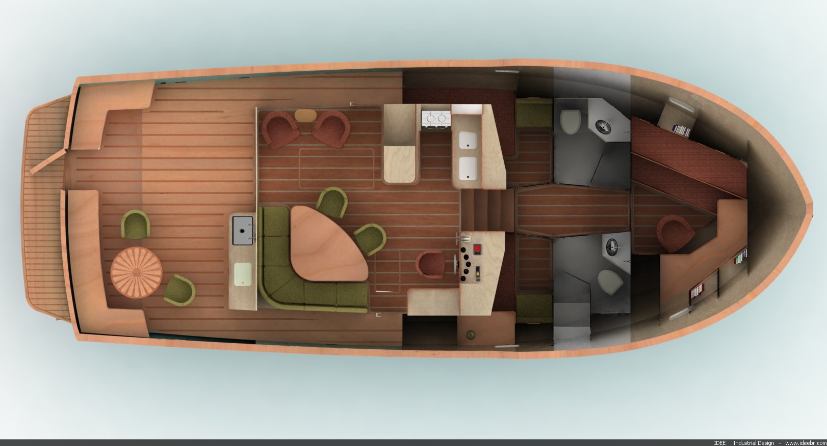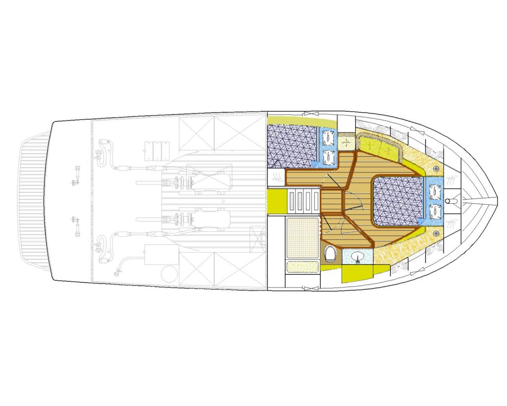 The second version of the fore-compartment layout has an owner’s stateroom served by an ample bathroom, plus another cabin with double-berth. This layout is perfect for families wishing to use the boat as a home, with comfortable quarters and room for kids or eventual guest for short periods.