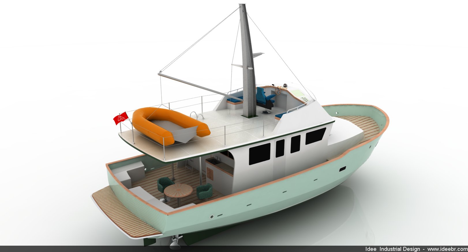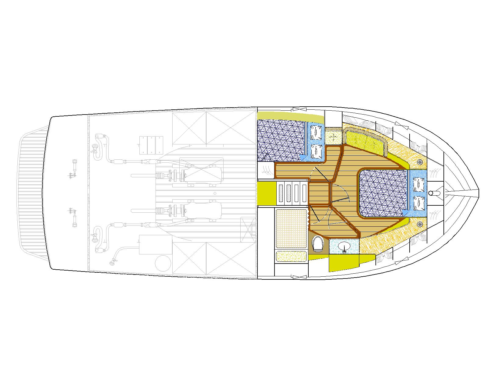 The aft deck furniture equals in cosiness and comfort that of the main saloon. There are two L shaped seats, one at each corner of the transom, the starboard one being added by a garden style table with two extra chairs. To make life more enjoyable, a kitchen bench, with sink and refrigerator, is placed at the rear of the saloon aft wall, a step away from the aft deck seats. The cold beer is at an arm’s reach. Functionality is the design principle for the fly-bridge. The pilot seat is placed just in front of the auxiliary mast, which main function is to hold a pole intended to be used in hoisting the tender boat to the upper deck. The pilot seat is sided by a pair of double seats, just abaft the fore coaming polycarbonate wind screen.