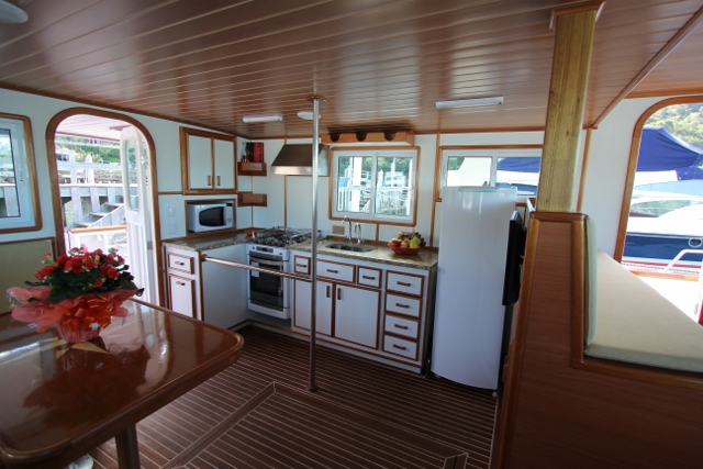 The part of the saloon designed for entertainment occupies more than half the area of the pilothouse. Seven passengers seat comfortably at the dining table and there are two other armchairs at the other side to complete the living-room accommodations. A complete U-shaped galley, with double sinks, four burner stove with oven, refrigerator and freezer, is placed at portside. There is room for the installation of a washing machine next to the two sinks and a microwave oven can be fixed above these sinks. The piloting station, comprising of navigation table, steering wheel and instruments panel is placed opposite to the galley.
