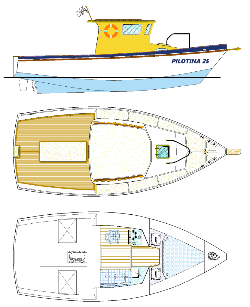 The Pilotina 25 is a strong and seaworthy motorboat design that is suitable for  protected waters or for coastal navigation. With excellent range for its size (more than 600 nautical miles with a 22 hp engine) and with capacity of up to ten passengers for day cruising, the Pilotina 25 is the ideal boat for those who enjoy fishing, diving, gunkholing or coastal navigation.