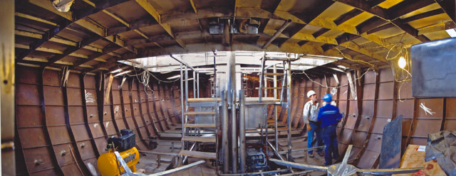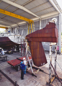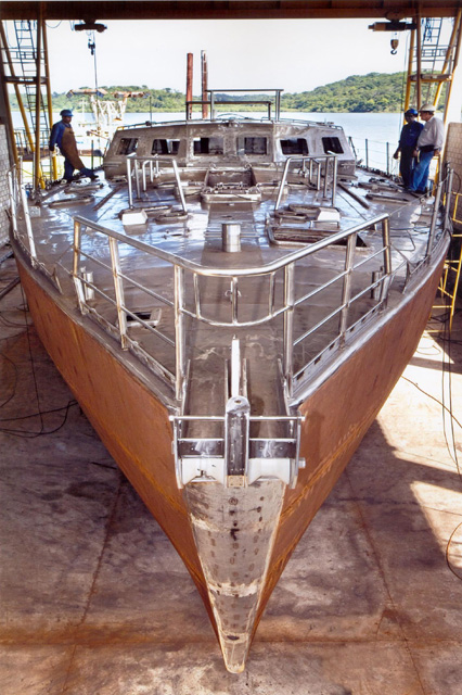 At the aft end of the keel runs in a ratch and pinion mechanism that will lock the moving keel at any height. This is a safety device that brings tranquillity when operating in remote regions under extremely rough conditions. Stability is enhanced by internal ballast.