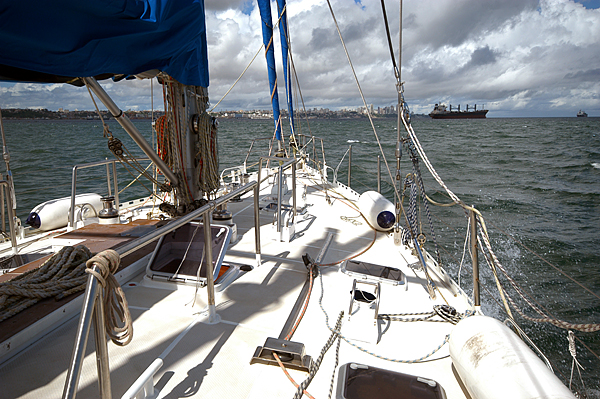 The fore deck, in front of the main mast, is a clean working area. The bollard, mid and fore stay chain plates and the electric windlass are fitted there. An 800 mm x 800 hatch provides access to the watertight foc´s´le. If a rigid bottom inflatable is to be carried aboard, the fore deck is the best place to stow it.
