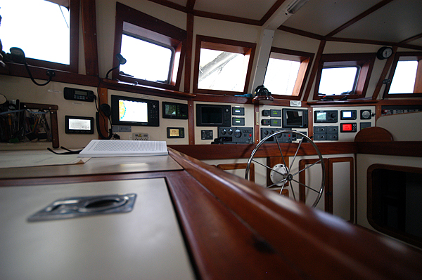 On top of this hatch is a solid dodger frame with extensive visibility through laminated glass windows that spares the crew from spray when getting out and to protect the pilot house from solid water going down below.