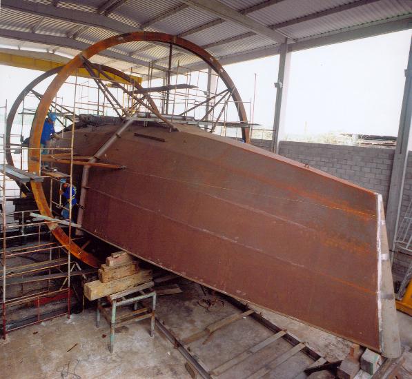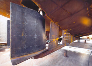When the keel is down the gap in between the keel and the hull is closed by a beam that covers the root of the keel and extends to the after end of the keel box. At the front of this beam is the pivoting pin and lifting plate is attached to the rear end.