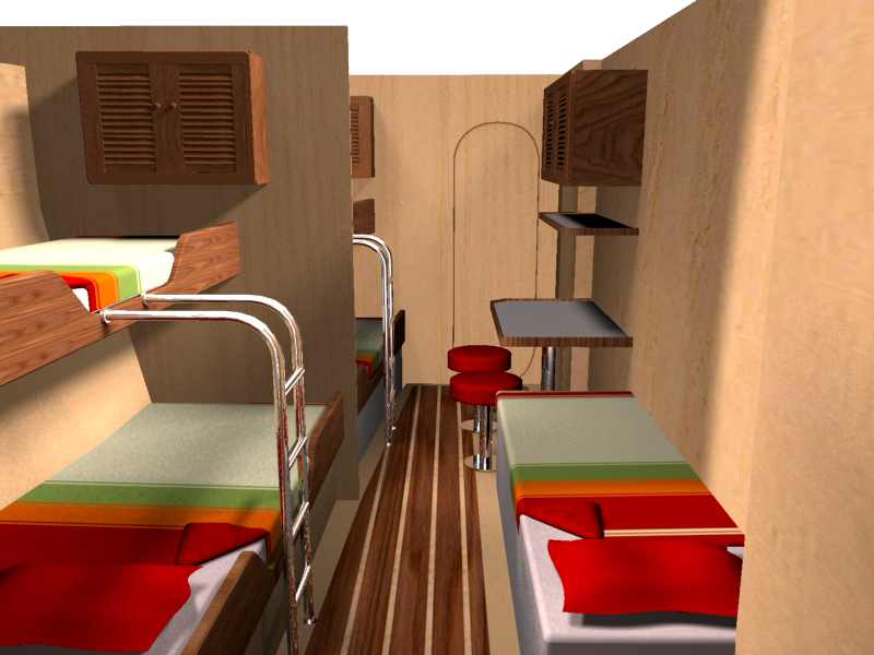 At each side of the engine room there are two corridors that give access to the living quarters located at both sides of the keel case. The stock plan considers the need to accommodate a large crew, and to fulfil this purpose, we designed a family cabin at port side with no less than five bunks, plus a working desk with stools.