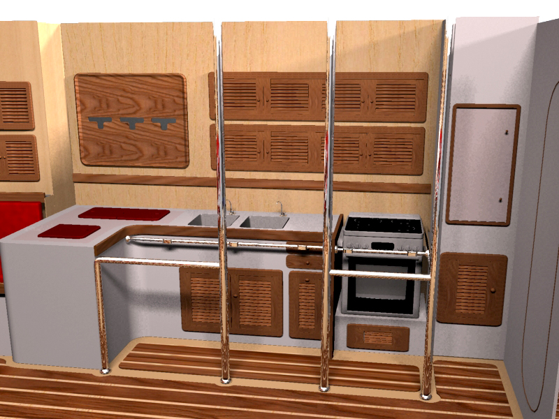 The floor at the working area is protected by a rail where the cook can lean his back against it, without risk of falling to leeward in case the two hands are required for the pots. The Engine Room separates the galley from the study.