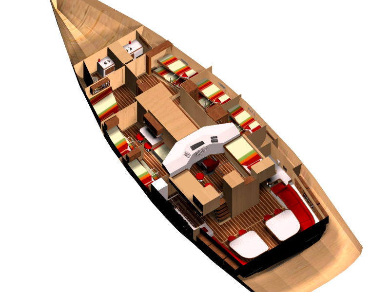 This interior arrangement is by no means a rigid one, except for keel case and structural bulkheads, everything can be designed to suit your specific needs. Contact us to discuss customisation.