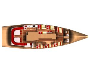 The Polar 65 is a flush deck ketch with a pilothouse. Abaft the fore mast at centreline is located the cover for the swing keel case slot. This cover has a laminated glass port that allows visual inspection of the lifting operation from the main deck.
